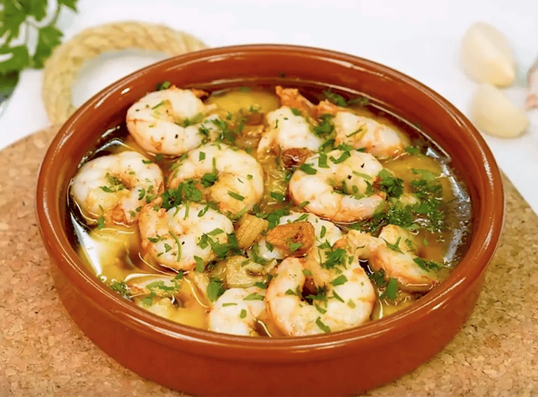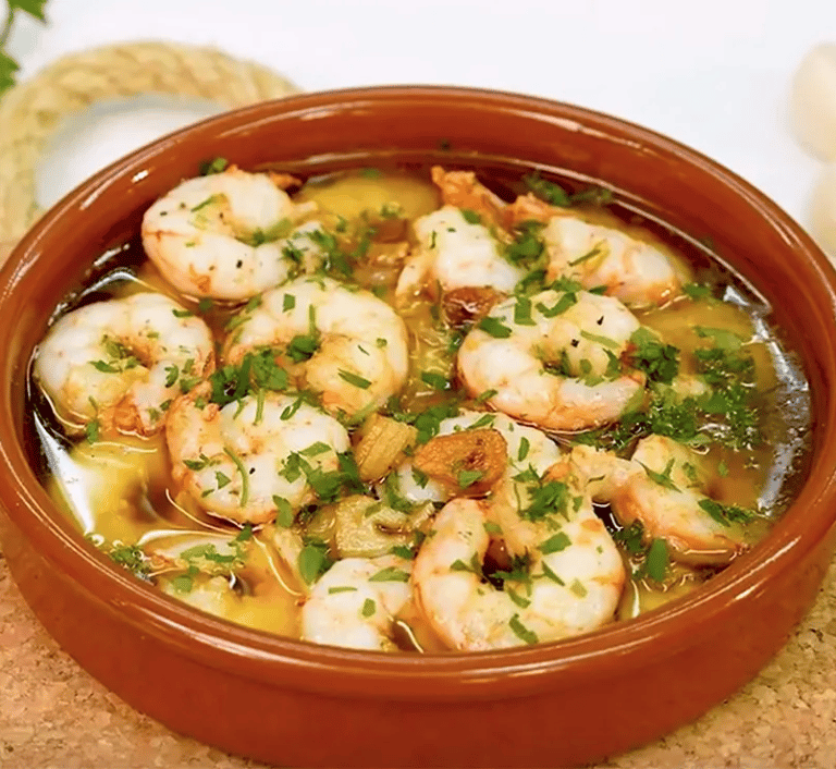 GAMBAS FRITAS EN ACEITE DE OLIVA CON AJOS Y ESPARCIDAS CON PEREJIL FRESCO Y SAL.