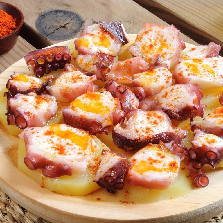 la receta gallega: pulpo, patata, pimentón dulce, aceite de oliva extra virgen y SAL.